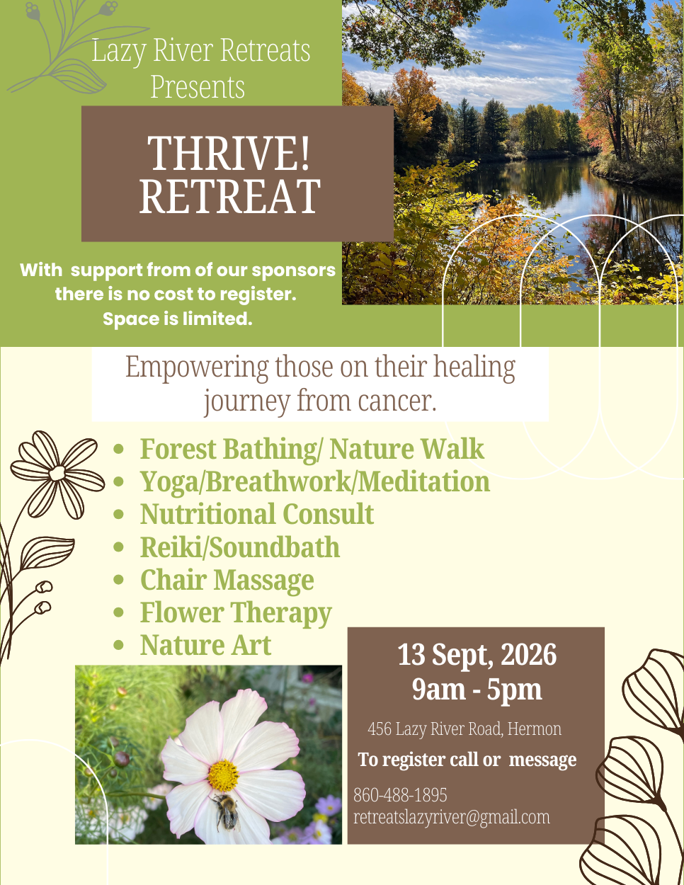 The Thrive! Retreat is a nurturing and empowering experience designed for individuals on a healing journey from cancer. This restorative gathering offers a safe, supportive space to reconnect with yourself, build resilience, and embrace renewed strength alongside others who understand your path. Through a blend of gentle wellness activities, meaningful connection, and guided reflection, the retreat encourages physical, emotional, and spiritual renewal. Sponsored by the St. Lawrence County Cancer Fund, this retreat is offered free of charge to all participants, ensuring accessibility for anyone seeking support. To receive a registration form, please contact Lazy River Playground and Retreat Center at retreatslazyriver@gmail.com. Whether you are newly navigating survivorship or continuing long-term healing, Thrive! provides an opportunity to rest, recharge, and truly thrive.